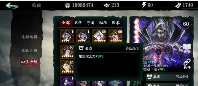 第二个绝技暴虐,算是一个被动的技能,基础等级为角色攻击力增加10%。