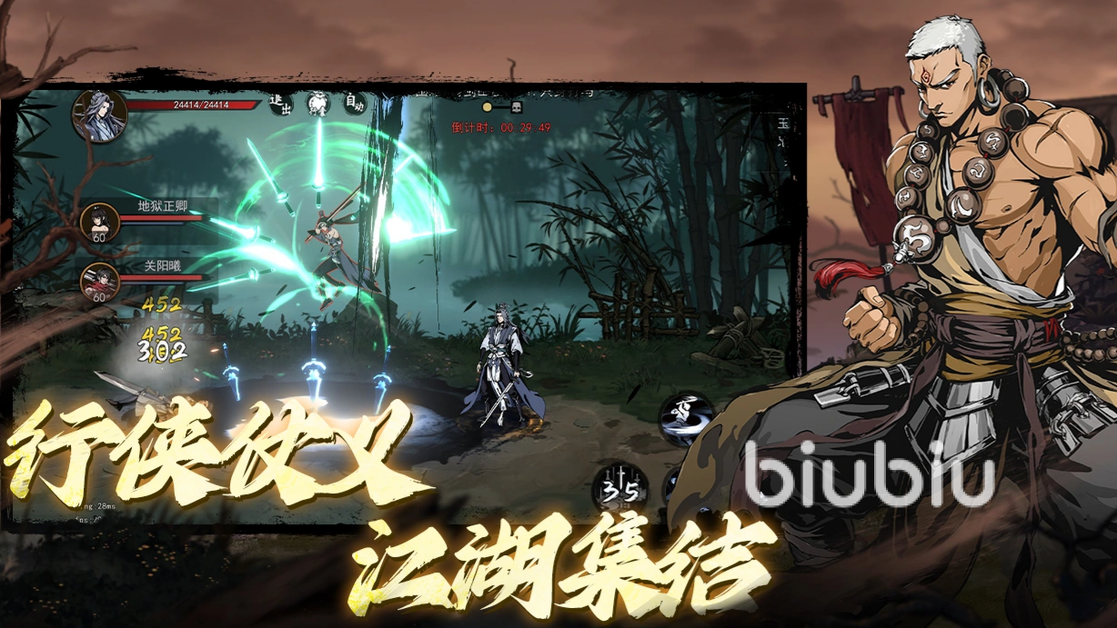 游戏采用水墨晕染技法,结合写意武侠元素,场景以淡墨勾勒山峦、村落,辅以血色刀光与暖色灯火点缀,形成独特的暗黑武林氛围。