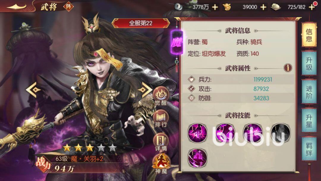 别看这套阵容里有魔-关羽,其实他的获取难度不高,通过活动可以获得,相信大部分玩家是可以拿到的,华佗,太史慈上方已经为大家介绍过了,主要为大家介绍其他三名武将,首先是魔-关羽,魔-关羽是这套阵容的核心,其dps输出甚至在吕布之上,魔-关羽是一个刷怒气值非常快的角色,他的大招如果击败了敌方目标,怒气就会回满,且下一次释放技能时伤害会提高,他的被动可以反弹伤害并且回复自身血量,触发以后用于非常强力的生存能力,魔-关羽的面板也是相当的恐怖,他有140的资质,他的定位时坦克爆发,身板肉的同时dps还高的要命,蔡文姬是一个辅助定位的武将,主要作用就是给魔关羽加暴击攻速用,大乔同理大乔可以降低敌方的防御,提升友方全体的攻速和怒气恢复值,这两名辅助搭配上关羽,可以说基本遇不到对手。