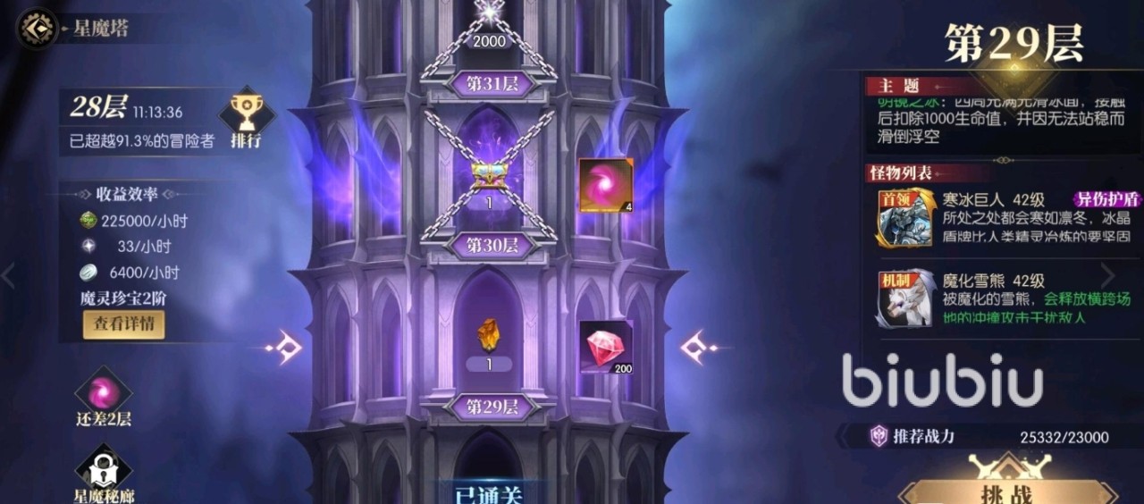 首先是29层塔的敌人配置方面,如下图所示,29层塔会有着明镜之冰的特殊buff状态,四周会充满了冰面接触之后,可以立即扣1000点生命值,并且因为无法站稳而滑倒。同时,敌人方面还有着寒冰巨人以及魔化雪熊的配置,练度不高的话很难进行攻略。