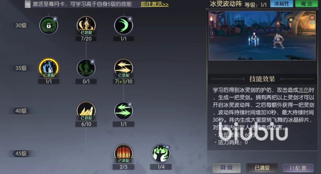 技能学习方面,比较推荐各位玩家们使用水灵波动阵,35级解锁学习之后,可以获得冰连剑的庇佑攻击,可以造成冻伤,并且生成一把灵剑,之后对阵内范围内的敌人持续性造成伤害。