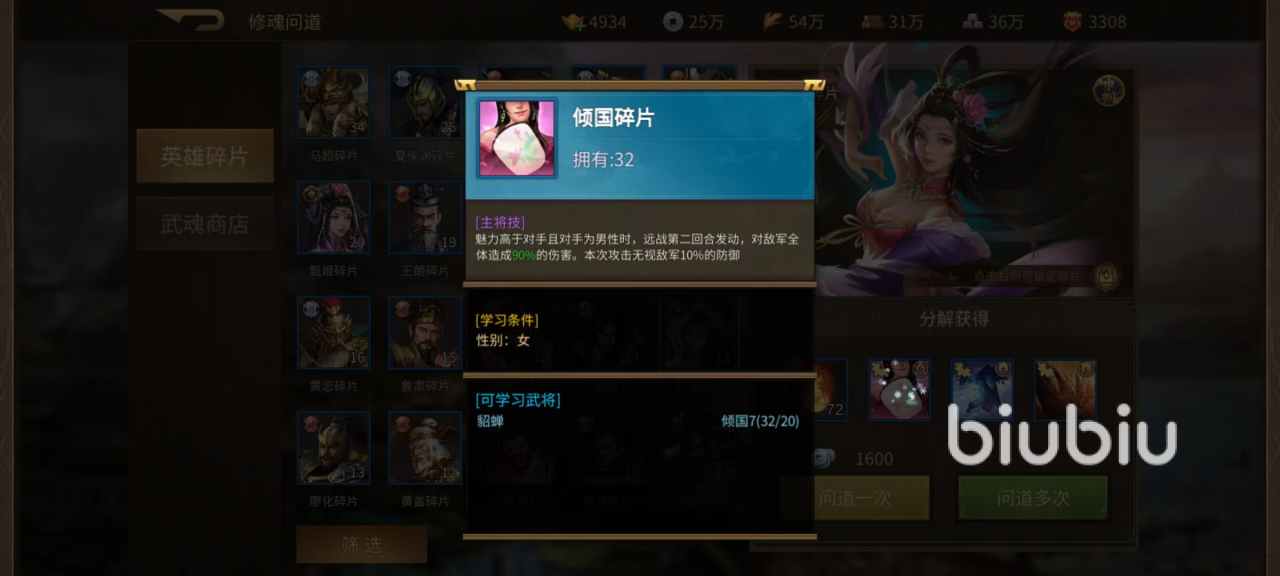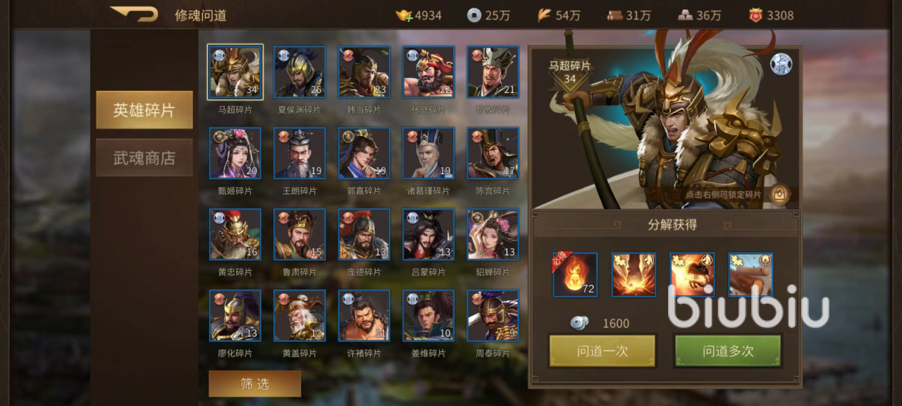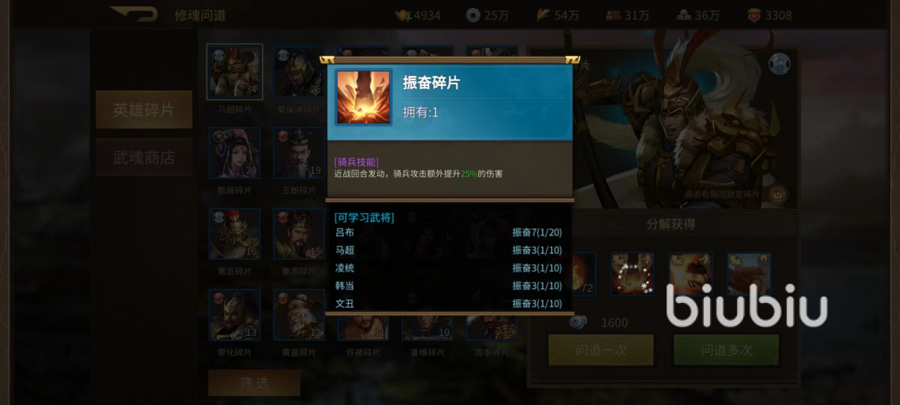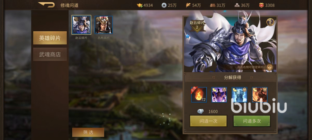 也可以有选择的进行问道,在下方有筛选按键,选中之后可以直接筛选出具有该相应技能碎片的武将。例如选择无双技能,就会筛选出赵云和吕布这两项,这两名武将都可以通过分解得到无双技能碎片。其他技能也可以同样以此方法来获得,这样则更加精准,可以帮助主力阵容快速提高技能等级。