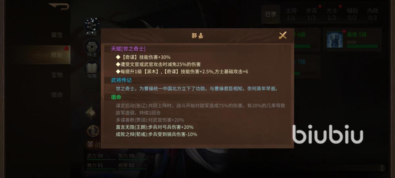 郭嘉属于英豪型武将,在本次测试期间因为没有开放更高等级的角色,所以英豪就已经是最顶级的一批,在属性方面非常强势。即使后期开放了传奇型武将,相信依然能够成为队伍中的主流,所以在各项属性方面,郭嘉完全没有问题。进入战斗后,前军步兵,后军方士,自身天赋世之骑士,使用奇谋技能时伤害提高30%。一旦受到敌方文官或武官攻击,将减免25%受到的伤害。还有一个效果是每提升一级滚木技能等级,则技能奇谋伤害获得提升后,军方士士兵基础攻击力提升。