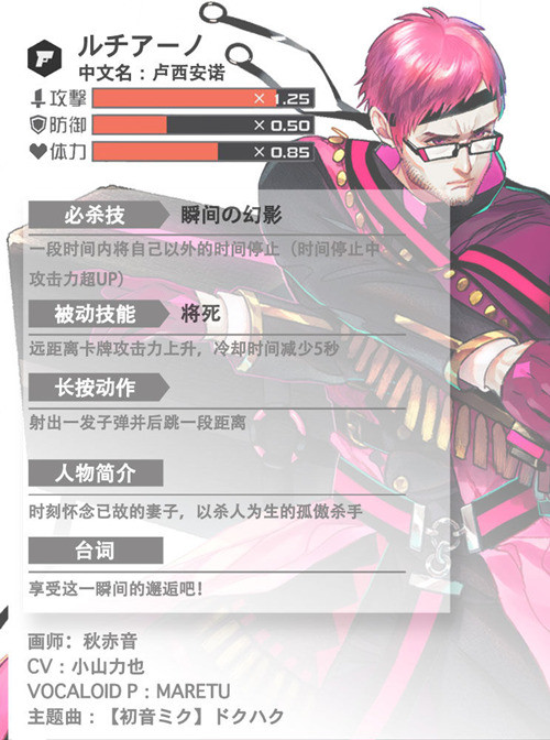 必杀技“刹时的魅影”:特殊效果技能满分,发动后3.3秒内,除本身以外的人时间阻止,无法挪动。卢西安诺可以在时间阻止期内一击必杀。如果对手坐落于无敌状态,则技能失效。