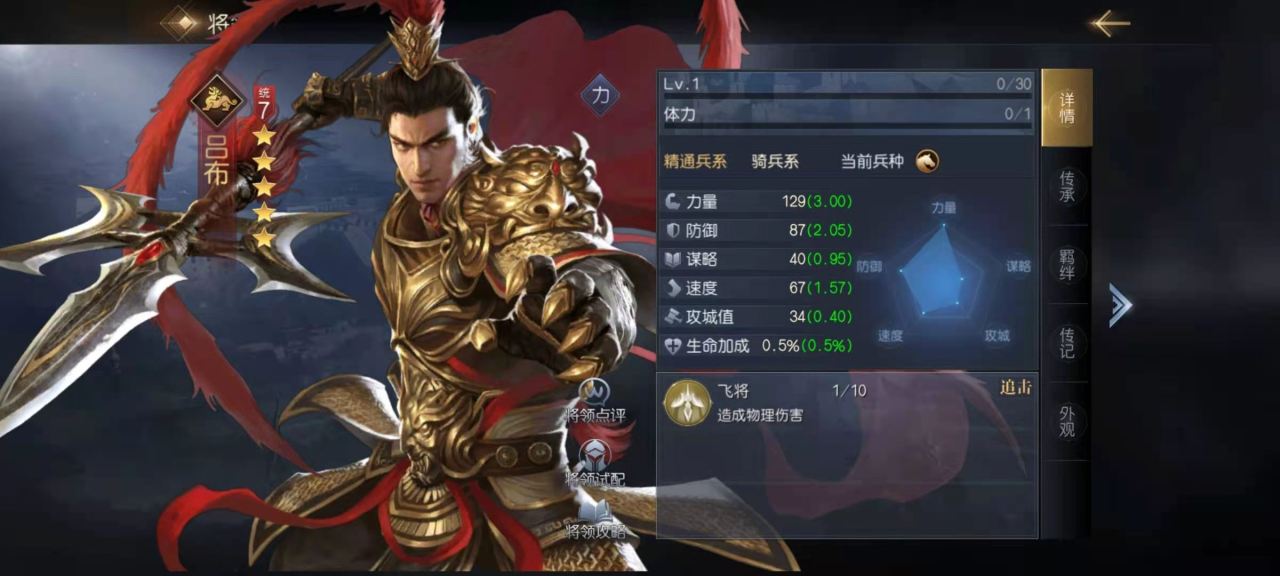 吕布本身是骑兵武将,从属性图上可以看出力量是满值的,谋略很低,防御和速度都是一般,自带的技能是飞将,效果是在战斗开始之后的三个回合内,造成普通攻击伤害的时候会对敌方全体武将造成一次物理伤害,满级之后技能发动额额概率为70%。