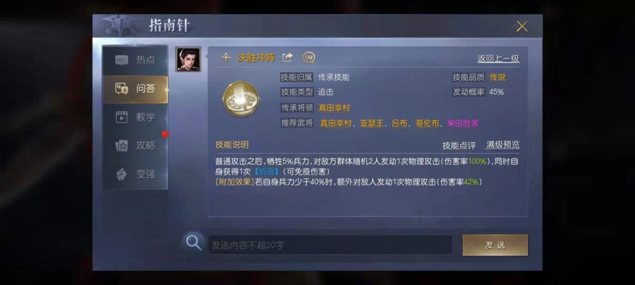 冲胜决胜是由真田幸村传承来的,效果是在进行普通攻击的时候,先消耗自身5%的血量,然后对敌方的随机两名武将造成一次巨额的物理伤害,并且自身获得抵御效果,并且在自身兵力少于40%的时候,还可以额外发动一次进攻。