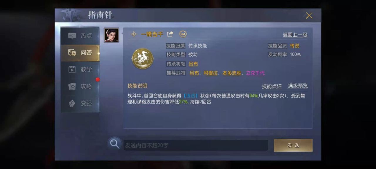 所以为了扬长避短,小编选择的是在武力伤害上走到底,建议大家选择一骑当千,决胜冲锋这两个技能,一骑当千的可以由吕布自身,本多中胜等武将传承获得,效果是在战斗的第一回合内,使得自身获得连击效果,并且受到的伤害降低27%。一骑当千的连击效果依然可以触发吕布的飞将,两个技能的配合非常完美。