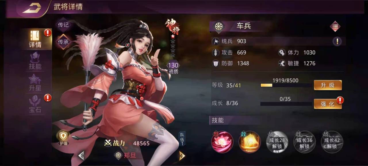 郑旦属于资质130的护盾型武将,怒气技能是剑舞春秋,效果是自身受到的火系伤害降低,同时降低敌方全体武将的免伤效果。作为防御系,这些效果足可以让郑旦对团队起到很大的辅助效果。钟无艳属于步兵武将,怒气技能是定国之策,效果是伤害敌方全体武将,并且进入易燃状态,可以和伍子胥相搭配,在队伍里起到压低对方血线的作用。
