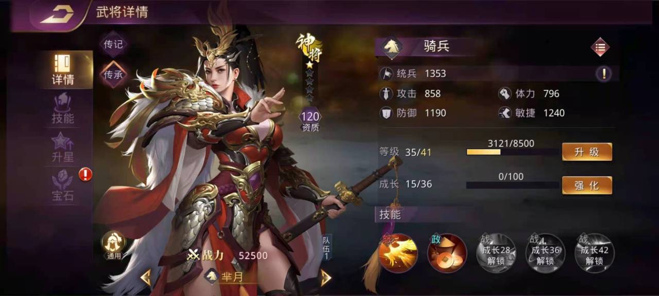 芈月属于资质120的骑兵系通用武将,怒气技能是凤驾威仪,效果是对当前的单体目标造成极大的伤害,成长之后还可以获得破敌和厚甲,亢奋的被动效果,破敌是在攻击的时候降低对方的免伤属性。厚甲是减少对方弓兵强弓劲弩的伤害,这样就减少了对方弓兵对骑兵的伤害,弓兵对骑兵的克制还是很厉害的,这样一削弱效果很明显。