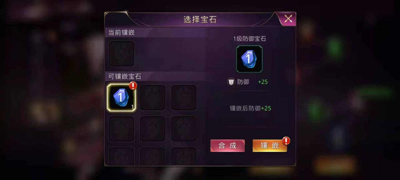 可以镶嵌的宝石有蓝色的防御宝石,橙色的敏捷宝石,绿色的体力宝石,红色的攻击宝石等,分别增加武将的防御值,敏捷值,体力值和攻击力。同一种宝石分为不同的等级,通过合成宝石可以得到更为高级的宝石,4枚低级宝石可以得到一枚高一级的宝石,高级宝石在属性上更强力。