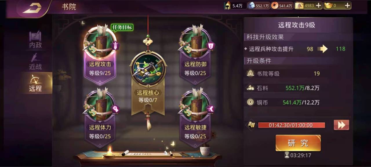 武将搞定了就该装备了,高等级装备一般是在铁匠铺中打造出来,然后在进行升星,所以提高铁匠铺等级可以获得更极品的装备。小编推荐大家优先全部配上紫色装备,然后再消耗中山奇石来进行升星,这样装备的搞定了。最后是科技提升,在主城的书院中,可以提升近战武将和远程武将的攻击力,防御力,体力和敏捷,这些都可以直接加成到战力上。