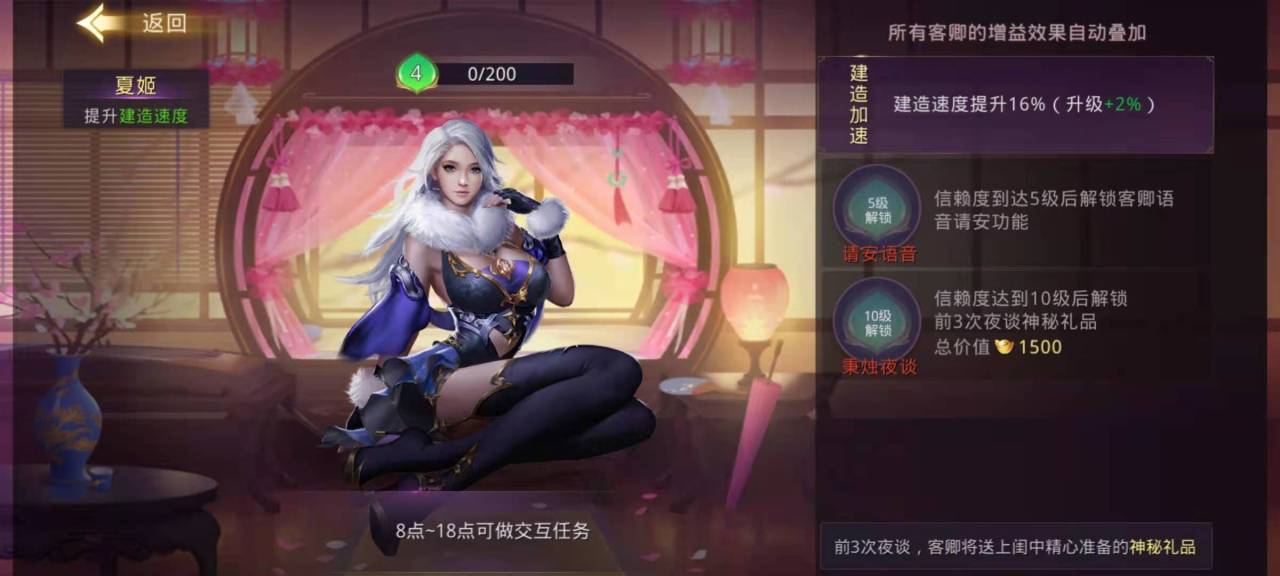 其他的红颜知己提升方式是一样的,只不过需要的礼物不同,夏姬最简单需要的是铜币,西施喜欢的则是罗伞,罗伞属于紫色道具,可以在市场中购买到。芈月需要的就是凤钗,只能在贵族商店中购买到,非常珍贵。信赖度提高了之后,就能解锁红颜知己的特殊技能,例如夏姬的是增加建造速度,小七的是提升科技速度,西施提升的是伤害减免,芈月提升的是暴击和抗暴能力等,都是非常有用的属性。