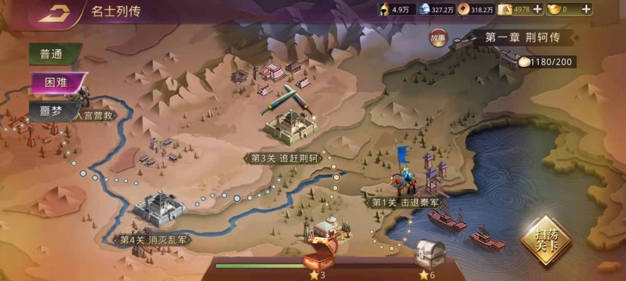 玩家在普通副本进度达到第五章之后,就可以开启困难副本模式了,困难副本每一关需要消耗10点体力,而且奖励的经验和点券,武将碎片等都要高很多,所以困难副本是玩家消耗体力的好去处,要想尽量多的通关困难副本关数,以及获得三星开启扫荡功能,我们则需要做一些准备工作。