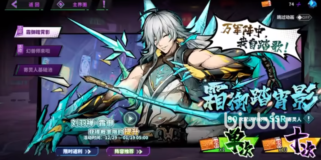 新号登录游戏都会开启7天新手活动,登录累积签到7天可以获得灵将契约券、武器锻造券与SSR角色幻兽师。此外还有一个长期连续8周的周一签到的活动,每周的周一都有不同的签到奖励,其中累计第5周的周一可以获得SSR角色门司令。