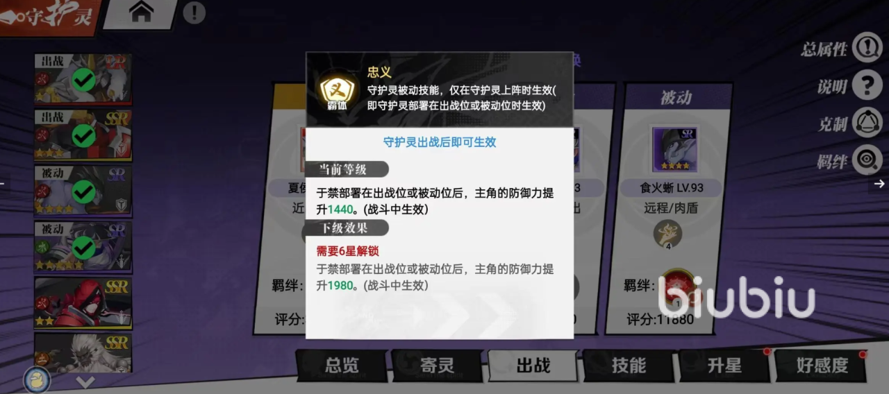 总而言之,在出战位的选择上,优先选择战力最高的守护灵就完事了,其次在选择一个克制敌方属性的守护灵比较稳妥,被动位上优先上高星级的守护灵,毕竟升星之后被动技能也会更加强大,能够给玩家带来更多的助力加持。