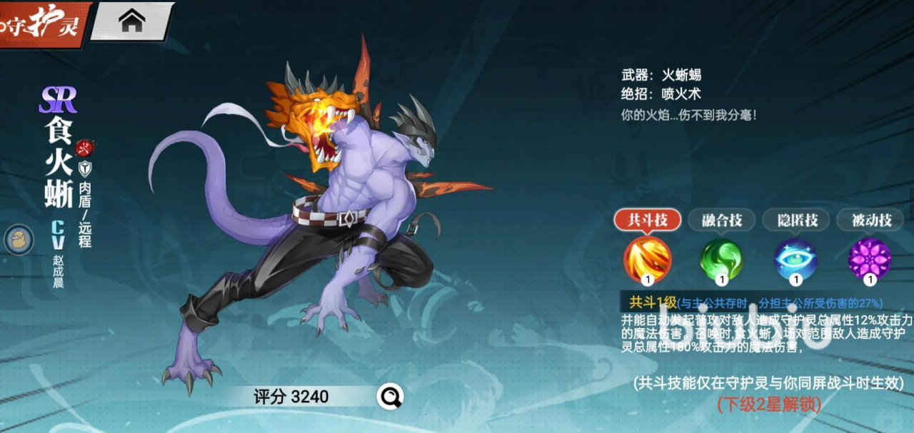 食火蜥,叫火焰蜥。虽然角色本身而言是一个较为低稀有度的sr卡片,非常容易获得,但其效果和被动技能却很不错。它能有效的提升角色的暴击伤害减免,能在对一些高爆发敌人时做到一定程度的保命状态。
