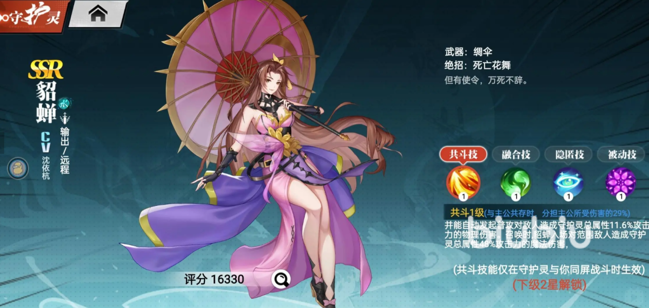 首先便是貂蝉,作为游戏中较高稀有度ssr,她所有技能都以输出为主。不仅有着可以破霸体的效果,同时还能在对局过程中造成很可观的杀伤。其中。技能倾城之花可以跟随敌人造成大量法术伤害的同时,并配合花舞的大范围攻击能给范围内的敌人造成多段的浮空伤害,无论是对于各类型杂鱼小怪,又或者是精英boss敌人,都能造成非常稳定的输出。