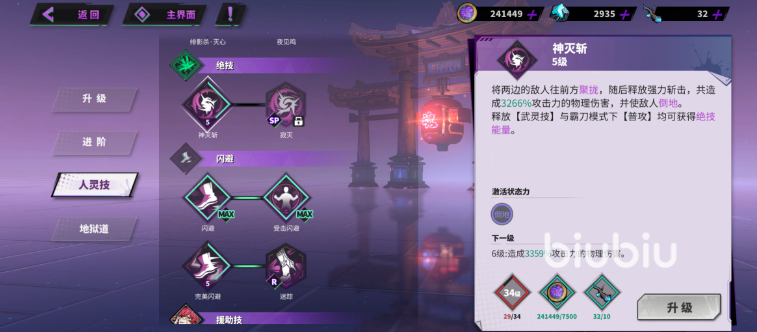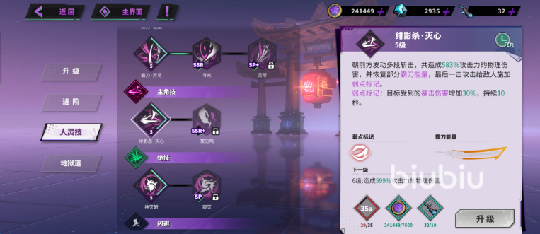 当霸刀值积攒到一定程度,貂灵芸就可以释放特殊的霸刀技能了,首先是一技能,绯影杀·灭心,在释放了这个技能后,除了可以造成超高倍率的物理伤害外,还可以为敌人添加上弱点debuff,提升敌人受到的暴击伤害,十分适合“星轨”这个套装。