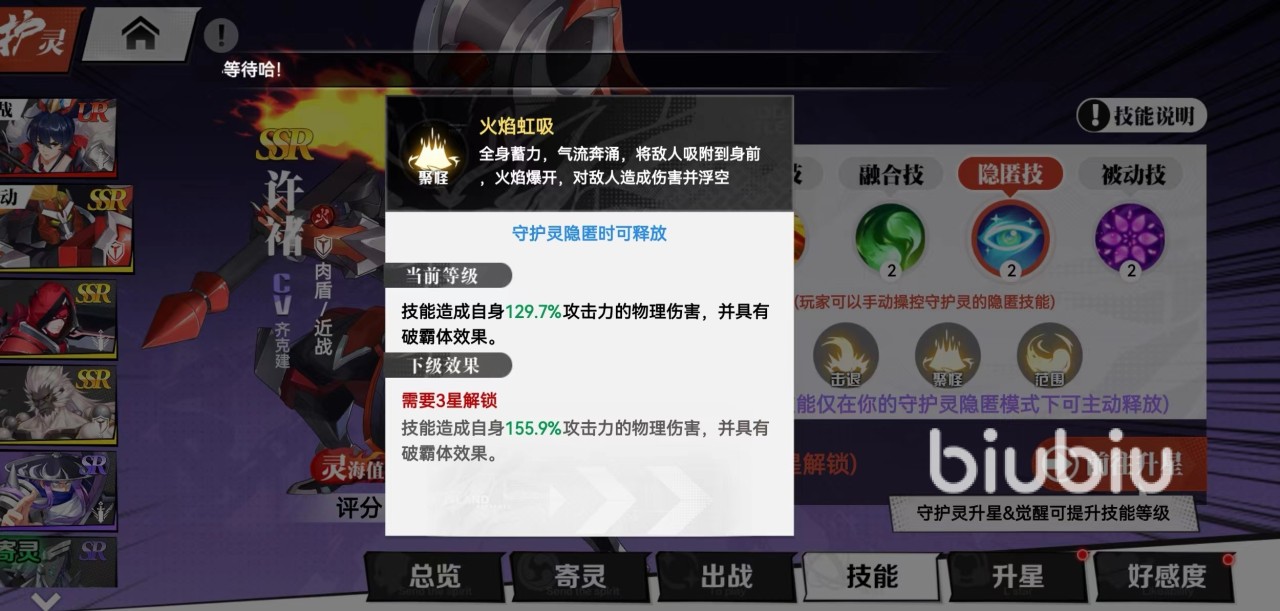 最后一个是被动技能,不需要玩家在战斗中操作就可享受效果。通常玩家自身技能用完后使用隐匿技效果最佳,可以填补技能冷却时的空档。敌人数量多、输出高的情况下可以用共斗技,可以让守护灵帮助主公缓解一波伤害压力。