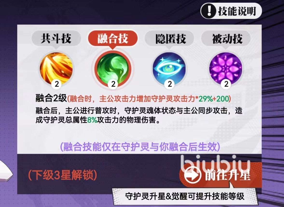 2.融合技:被动效果主公获得攻击力,攻击力提升和守护灵攻击成正比,并且主公战斗时守护灵的灵魂也会一起同步攻击。