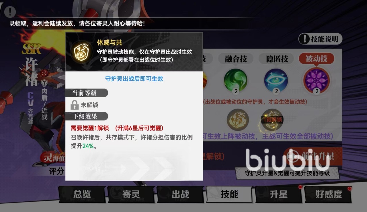 1.共斗技:被动上场时分担主公收到伤害的33%,召唤上场时造成范围性伤害,后续对敌人持续发动普攻造成物理伤害。