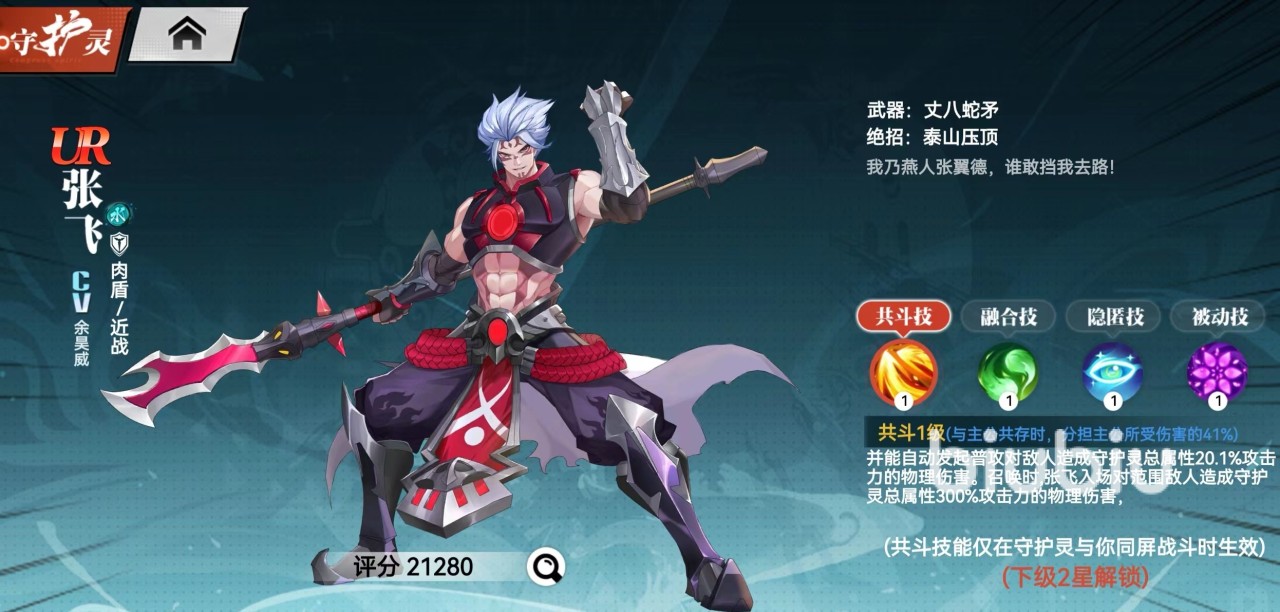 每个守护灵都是一样的,拥有4种类型技能,是根据战斗方式改变的,看过镇魂街的玩家应该能理解,确实很还原角色的战斗方式,下面看看张飞技能效果吧: