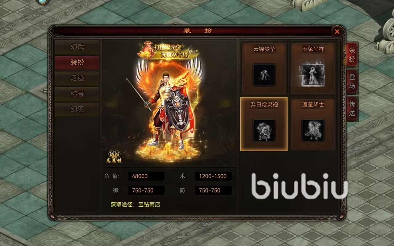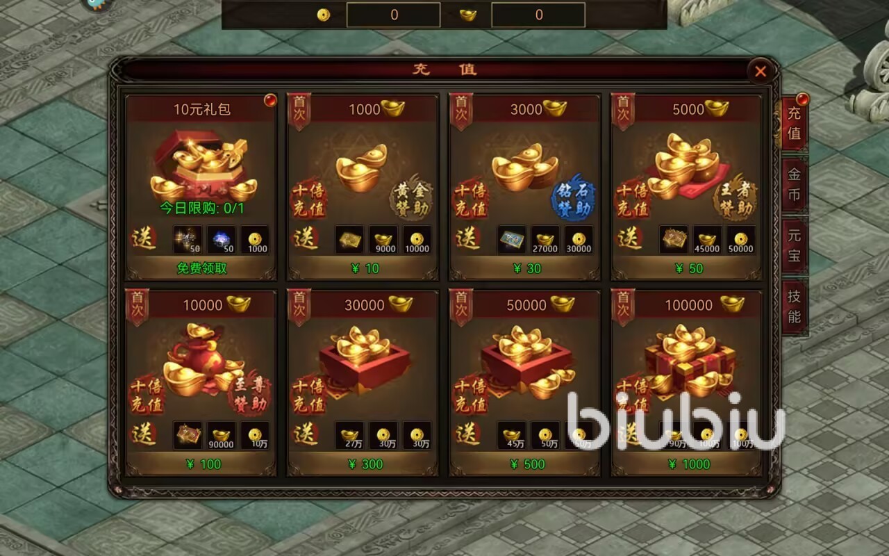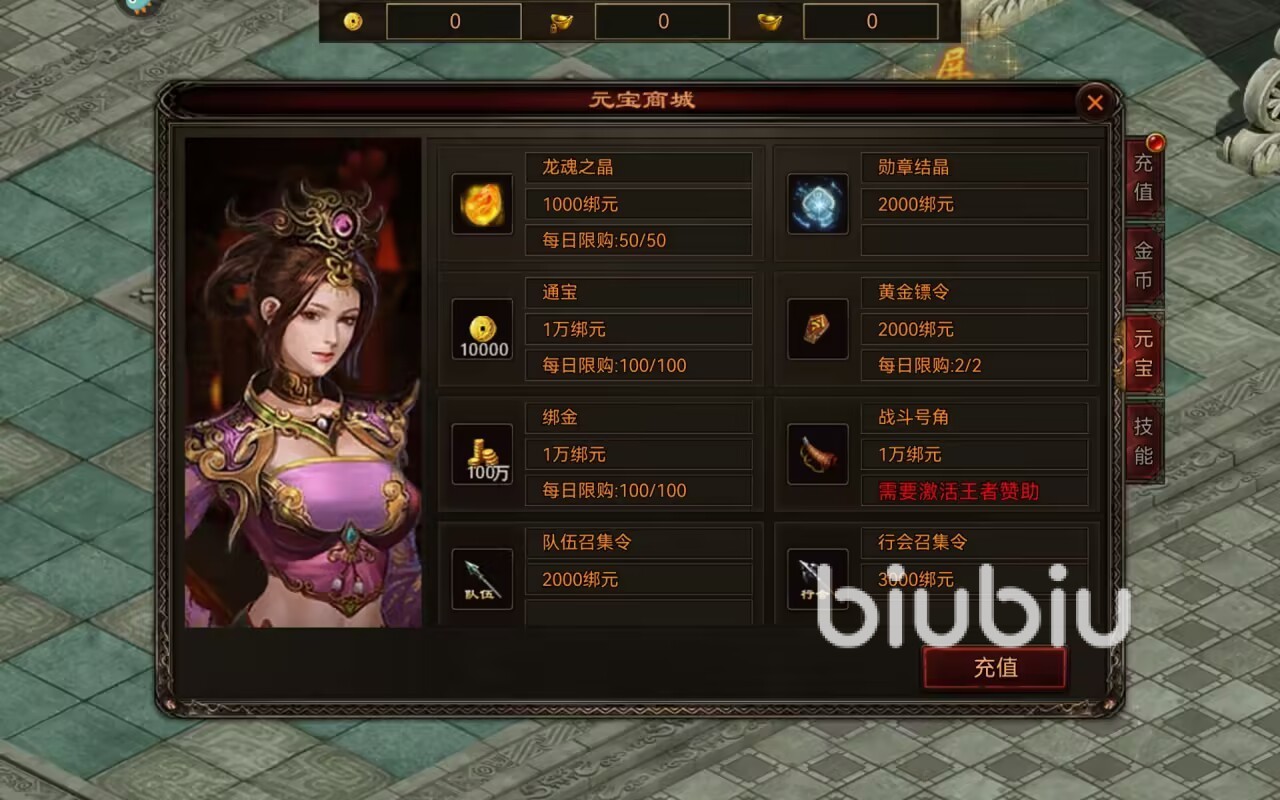 接着这里有对应的充值渠道,大家如果想在商场里购买自己需要的东西,那就需要在这里充值一种名为元宝的东西。其中也对应着不同数额的金钱,充值完成后就可以获得大量的元宝,就能拿来入手自己喜欢的道具或者时装。