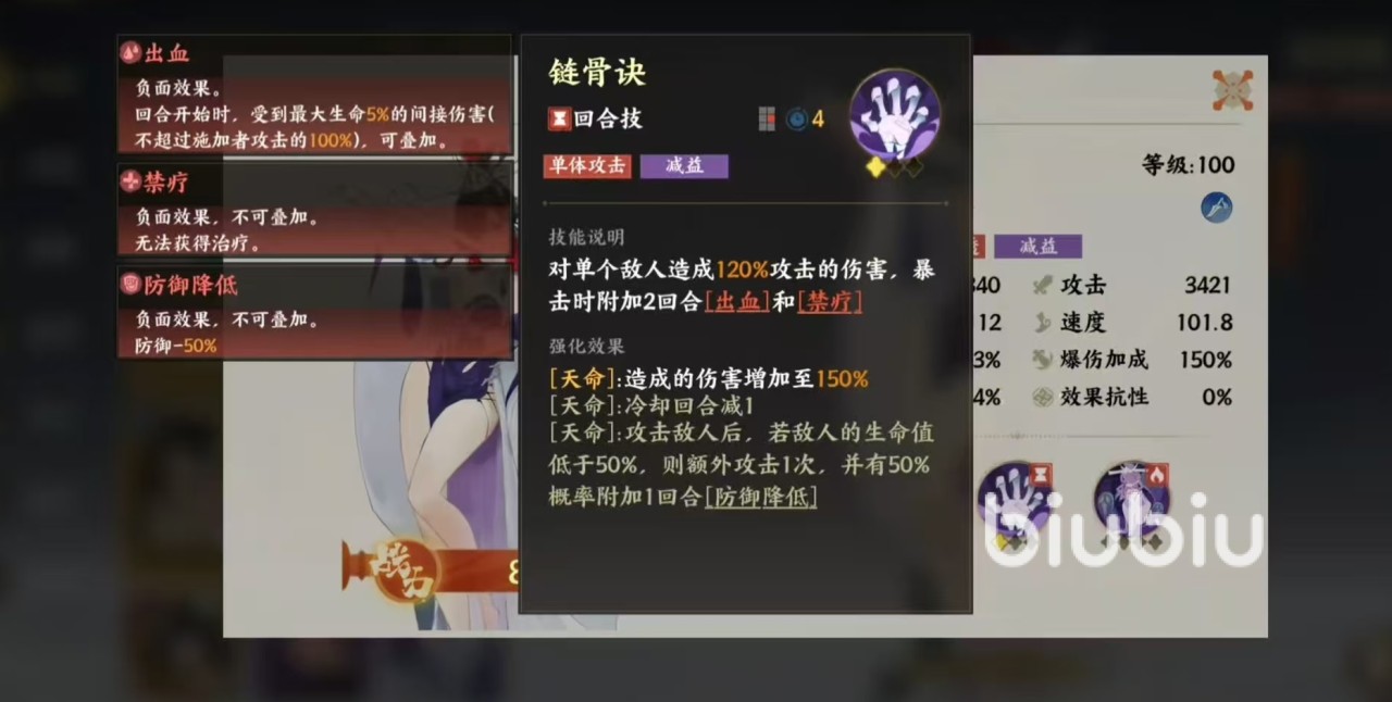 回合技效果是对单个敌人造成伤害,暴击时附加两回合出血和禁疗效果。通过强化,造成的伤害提升,冷却回合减少,在攻击敌人时,若敌人生命值低于半血,可额外攻击一次,有几率附加防御降低效果。这里所造成的出血,和普攻所造成的出血是一样的,可以叠加起来。禁疗效果指的是对方在持续回合之内无法获得治疗,这样就可以克制很多续航能力比较强的角色。