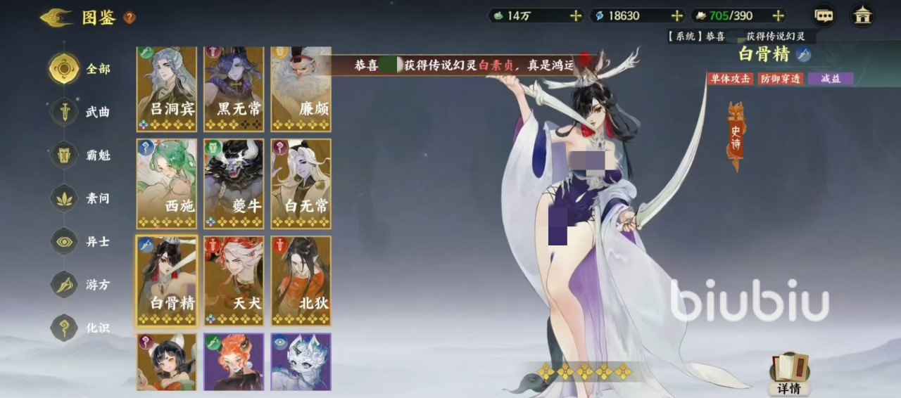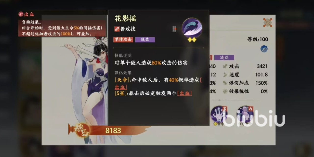 白骨精是属于史诗级品质,对于大多数玩家来说都是阵容中的主力,这个幻灵擅长单体攻击,具有防御穿透和减益等特性。自身的普攻可对单个敌人造成伤害,后续通过强化之后,命中敌人有几率造成出血效果,提升到五星时,暴击后必定会触发两个出血。出血是一种负面效果,对方被影响之后,回合开始会按照最大生命值的5%受到间接伤害,是一个可叠加效果,叠加起来之后伤害很可观。
