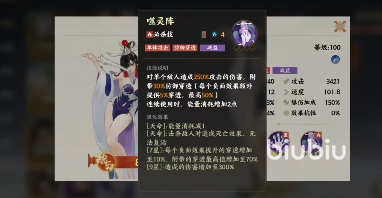 必杀技对单个敌人造成高额伤害,并附加防御穿透,对方身上每有一个负面效果,可额外带提供防御穿透效果。在连续使用时,能量消耗增加2点。强化之后的效果是击杀敌人后,可造成灭亡,使对方无法复活,附加的穿透属性大幅度提升,造成的伤害提升。这个技能可以作为很好用的终结技,对于低血量的目标能够实现直接秒杀。