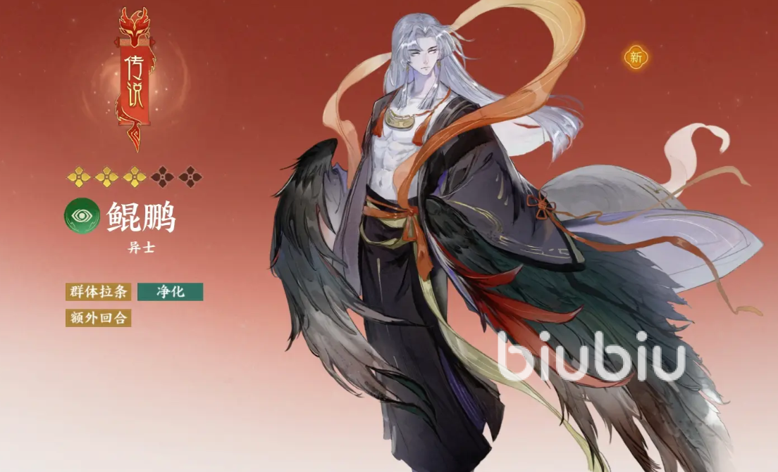 鲲鹏是一位能让我方实现速攻的辅助,他的回合技是攻击全体敌人,造成60%伤害,每成功命中一个敌人就有50%的概率降低1点“惊风飘月”的消耗,他的能量技“惊风飘月”会让全体队友的行动值提升15%,并且有70%的几率净化队友的1个负面。