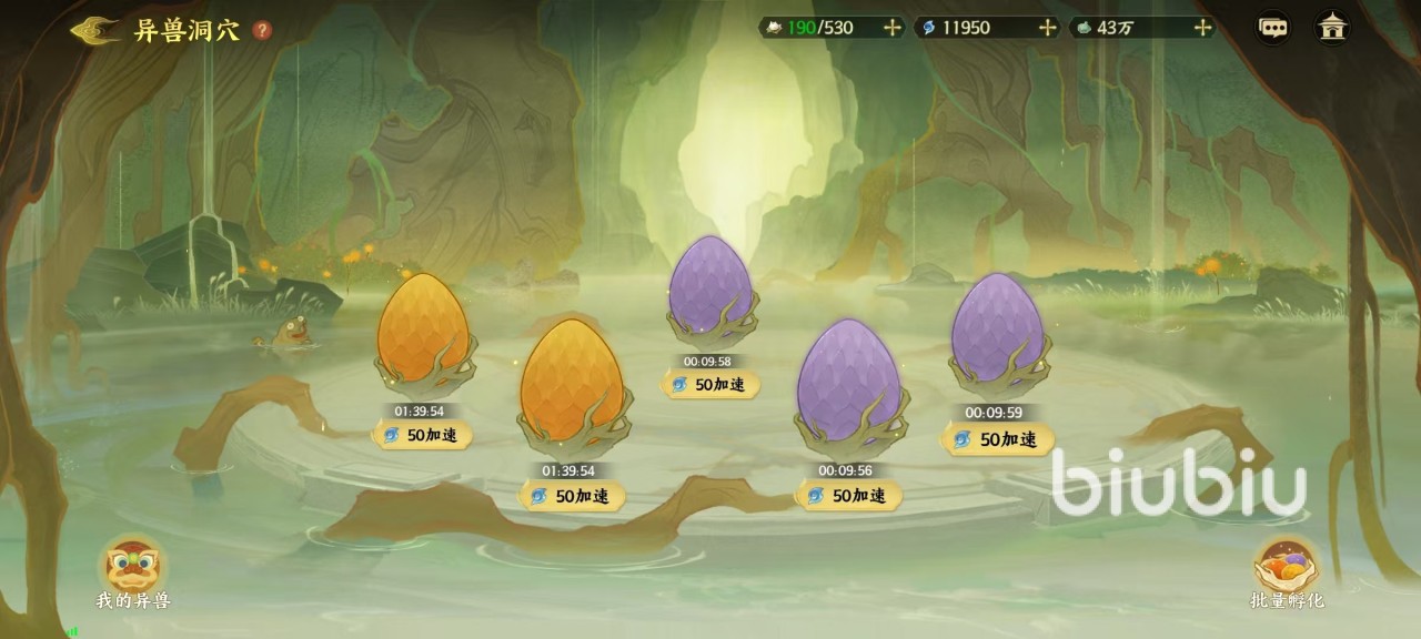 这款游戏中的异兽功能,其实是和神树功能所绑定在一起的,大家只有在开通了生命之树之后,才能够解锁对应的异兽玩法。点击生命之树之后,就可以看到有异兽洞穴,这里面就是大家获得异兽的关键所在。获得异兽最重要的就是异兽蛋,获取到异兽蛋之后,在洞穴中可以进行孵化,最多同时孵化5枚异兽蛋。玩家可以点击批量孵化,然后在这里批量选中自己所具有的异兽蛋,就可以进行孵化了。