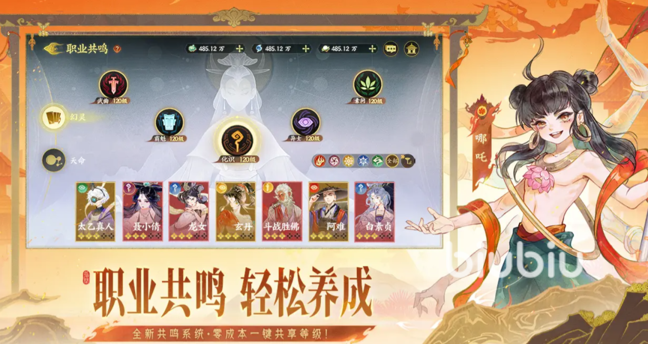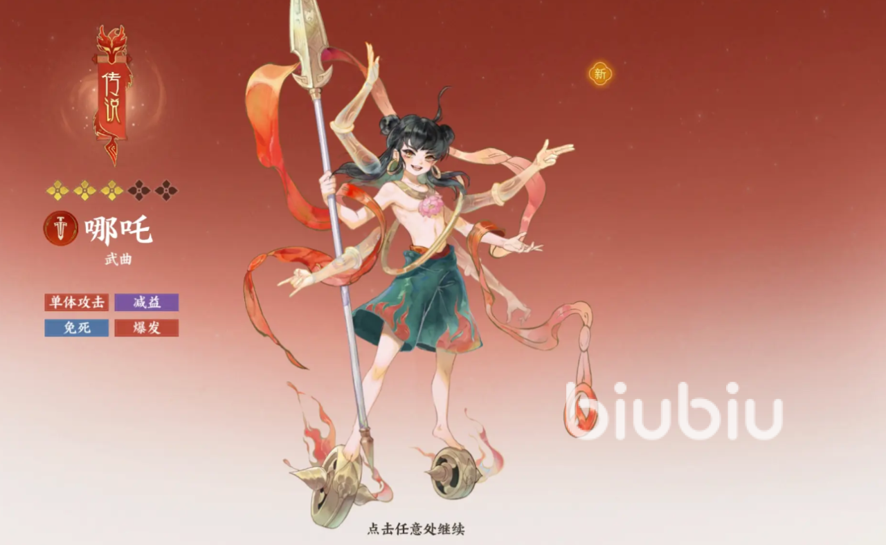 哪吒有着很强的单体爆发,他的普攻会对单个目标造成50%伤害,并根据已掉的血量比例来提升输出,若攻击前自身携带增益,则目标会变为敌方全体,他的被动技“灵珠”会在遭受致命伤时,获得1回合不死,下次的“降魔”不需要能量消耗,他的“降魔”会对一名敌人造成160%伤害,攻击时自身每损失10%生命百分比就提升4%伤害,攻击后会提升35%攻击力,并有一半概率对目标施加上无法使用技能的沉默。