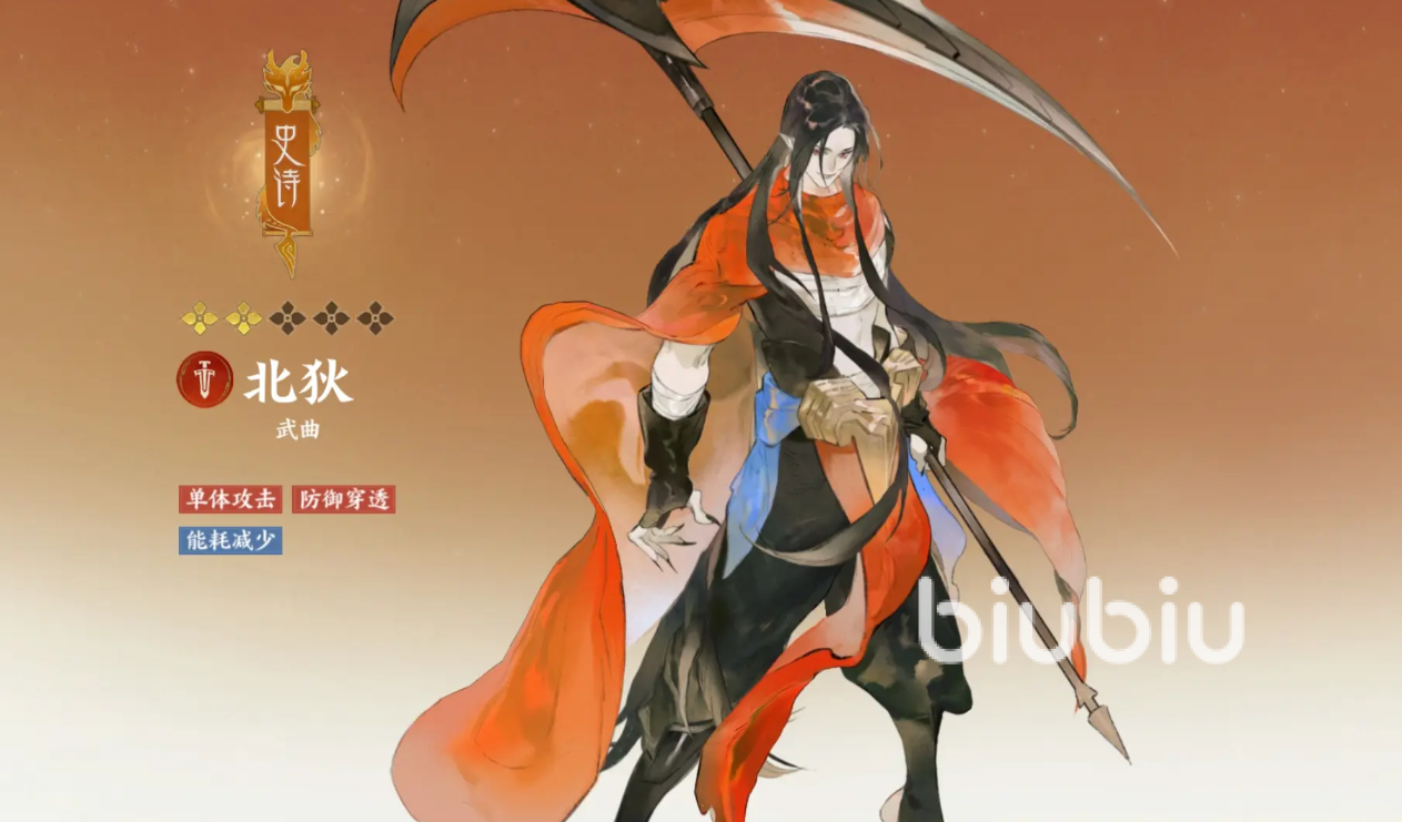 北狄的普攻会对敌人造成60%伤害,并有60%概率获得2回合禁疗,他的“千剪万裁”会攻击一整列敌人造成100%伤害,自身获得速度提升25%,攻击上升35%的效果,他的“刀影”会对单个敌人造成160%伤害,并附带上30%防御穿透。