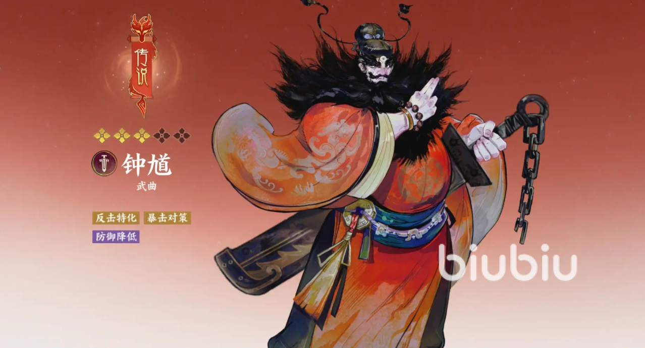 钟馗的普攻会对目标造成75%伤害,强化后使用会附带上25%防御穿透,并让暴击率上升35%,他的被动技能在战斗开始时获得3回合蓄力,让攻击和防御都上升25%,自身遭受暴击时,会发动强化后的普攻进行反击,自身未受到而其他队友遭受暴击,则直接发动一次反击,他的“鬼灭百烈斩”会对全部敌人造成80%伤害,命中后有50%概率施加两回合防御降低,让自己攻击加35%。