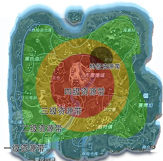 如下图所示,可以将地图划分为五个资源带。级别越低的资源带资源也就越少,级别高的资源带拥有较丰富的资源。