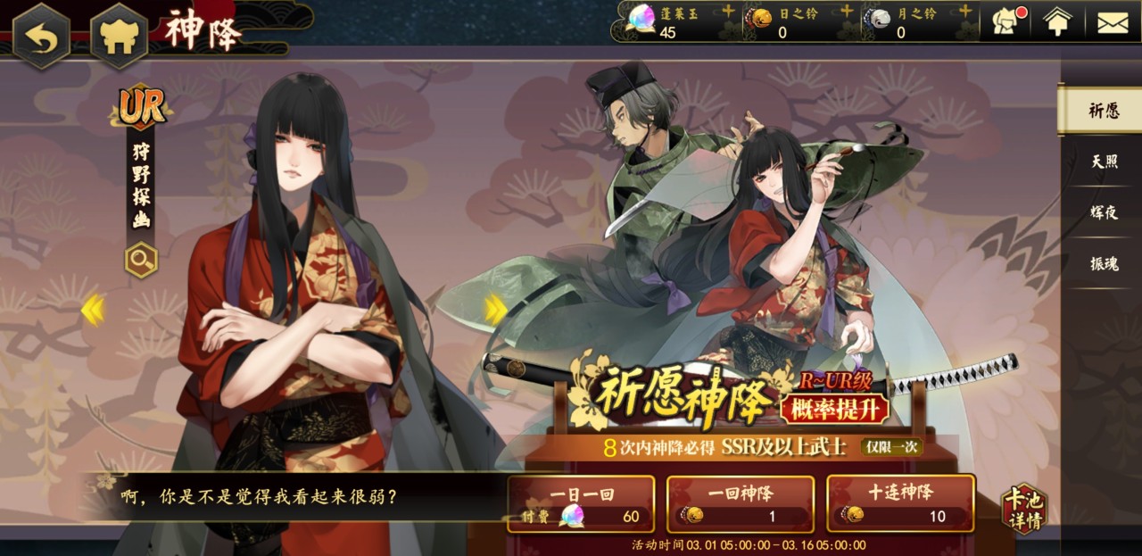 目前葵的获得途径只能通过神将系统来抽取,第一种是祈愿抽取系统,在祈愿抽取中玩家可以在一定次数内抽到SSR级别以上的武士,但是玩家只有一次机会,但是所有武士的几率都有上升。