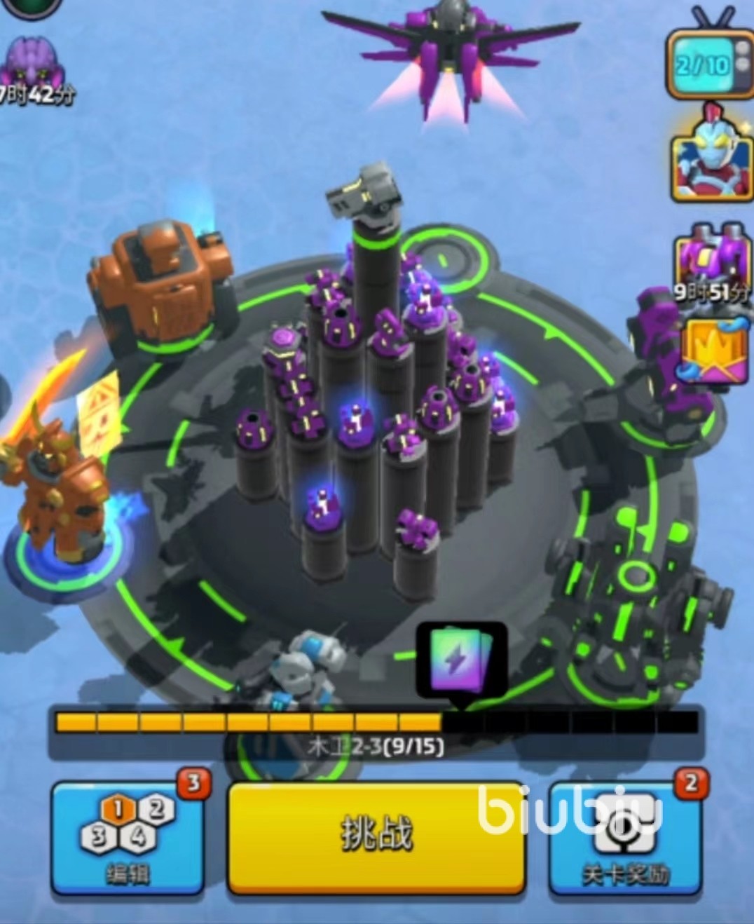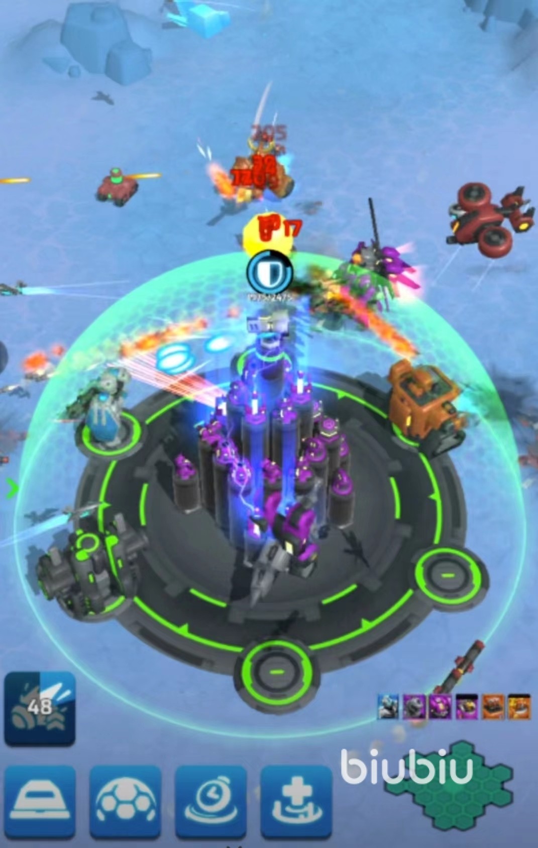 辅助塔则是治疗、猎鹰和护盾的搭配,护盾塔可上可不上。治疗塔优先治疗强度,其次是持续回血、装载速度和血量。猎鹰先强化召唤数量、伤害、血量和重生时间。