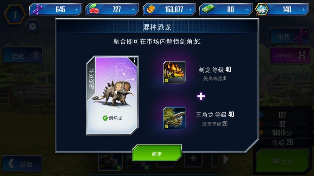 说了这么多混种恐龙需要准备哪些材料呢?玩家在恐龙的信息界面点击混种就可以看到,一般的混种恐龙需要两种基础恐龙来进行合成,在等级上需要提升到四十级。比如说三角龙的混种恐龙是剑角龙,而需要的材料就是剑龙和三角龙,等级在达到四十级之后就可以进行创造的融合了。