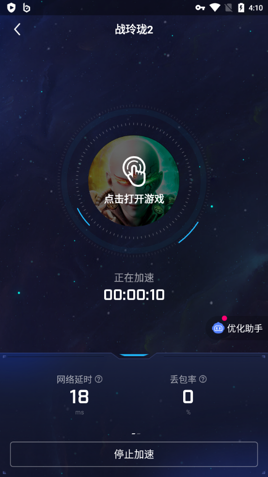授权完毕后,加速进度会自动启动,大家只用等到加速完成,即可点击屏幕中央的游戏图标,打开游戏。