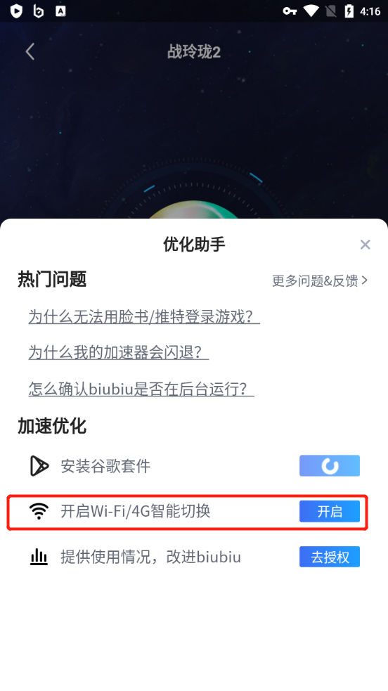 大家在游戏的过程中,如果发现加速效果不稳定,那可以回到刚刚的加速界面,点击右边的“优化助手”,开启一下wifi和4G的智能切换,这样可以有效解决由于家中路由器信号不稳定所引起的加速掉线。