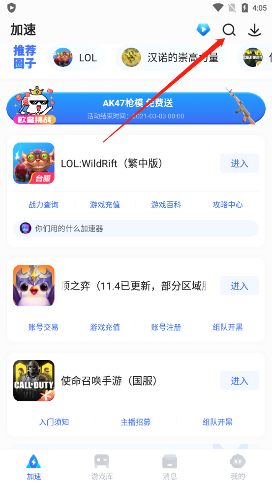 我们首先打开biubiu加速器,然后在首页的右上角可以进入搜索游戏的界面。