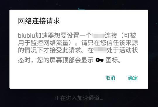 这里要注意的是,初次加速时,系统会提示大家为biubiu开启网络加速的权限,大家点击确认授权即可。