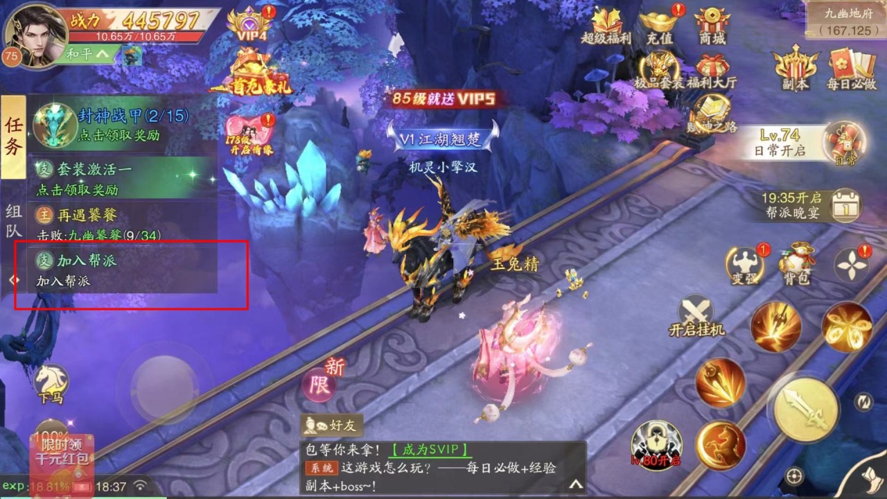 首先,你的等级要达到47级,然后左边的任务栏里就会显示出加入帮派的信息(如下图)。注意,没有达到等级要求的话,是没有帮派的这个功能的。