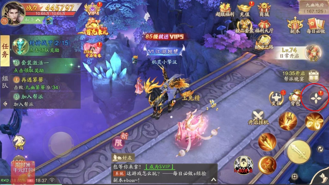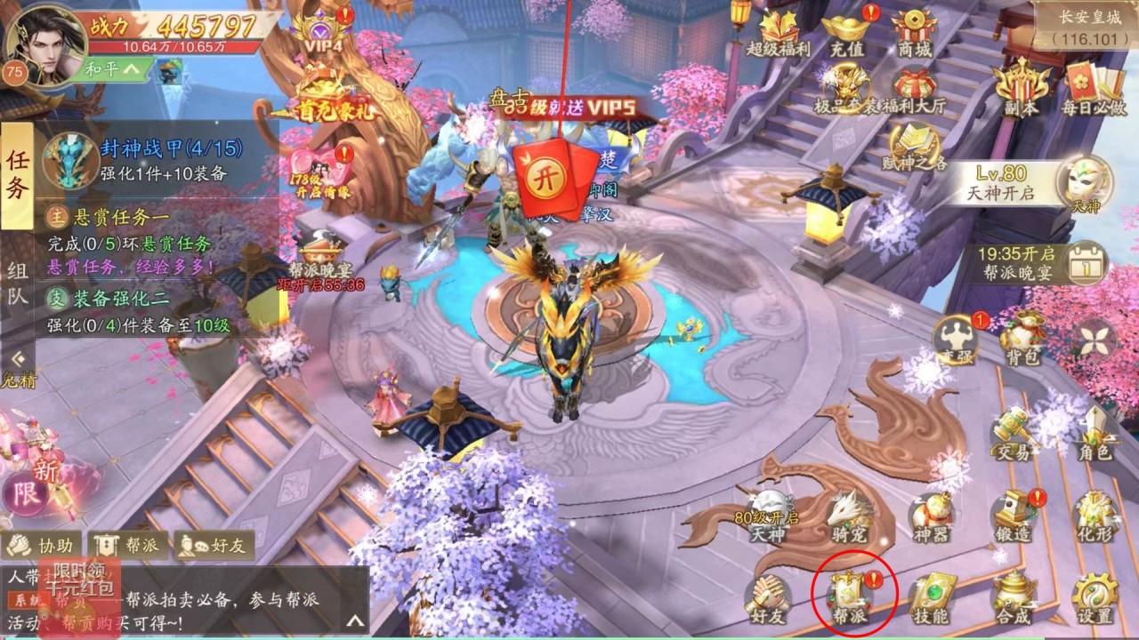 然后再在很多的功能里找到帮派的按钮,图中画红圈的地方,然后再点开它(如下图)。