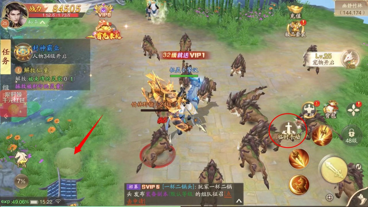 还有另一种方法就是,在打野怪的时候只要移动一下游戏内的方向盘,角色就从自动挂机变成了临时手动,也是取消的方法之一(如下图)。