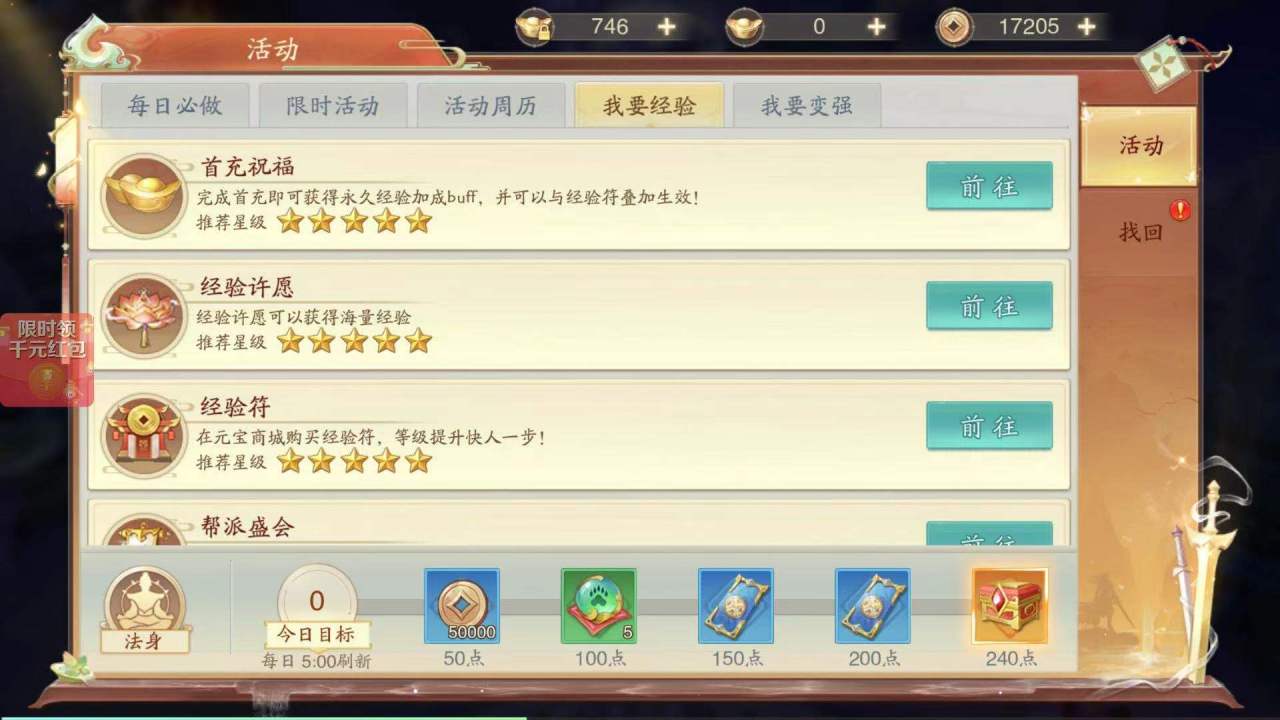 这种方法是玩法多样,而且不仅有装备铜币,还有大量的经验和经验丹。去点击每日经验那里,会有相应的经验获得推荐给你。(如下图)。