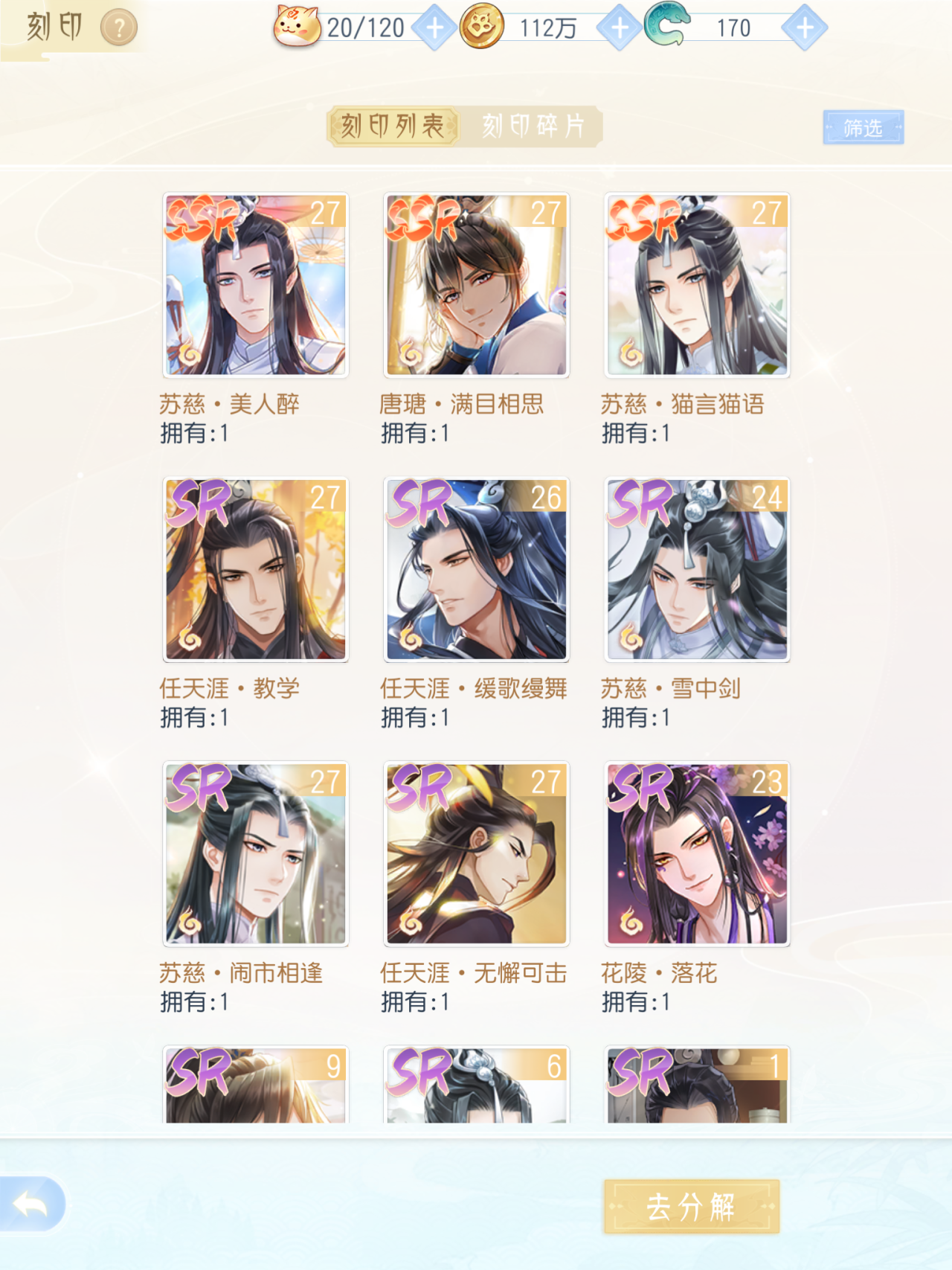 参与风絮令玩法可以获得刻印碎片,集齐100个ssr碎片可以合成一个ssr刻印,集齐50个sr碎片可以合成一个sr刻印,目前风絮令中的刻印都是卡池里没有的,因此要想集齐所有刻印,风絮令是必须要通关的。