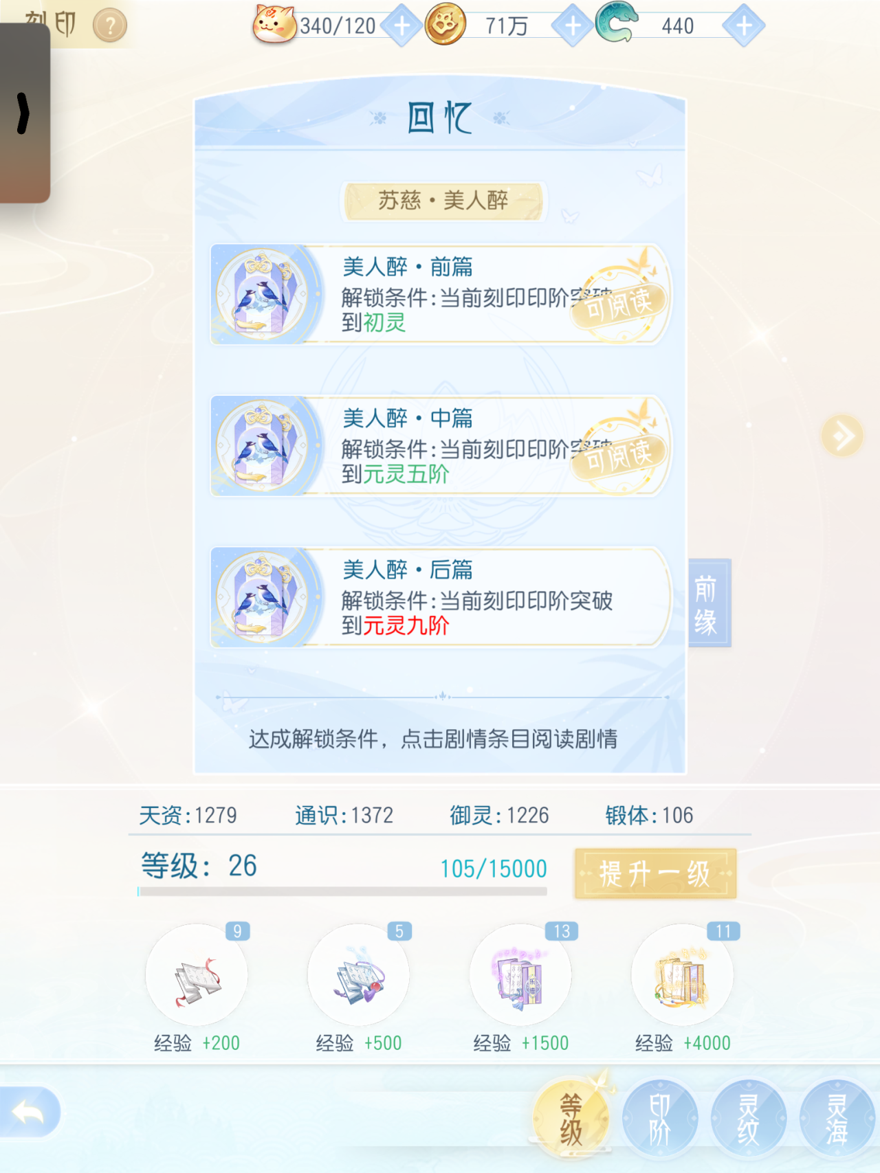 进入刻印界面,使用通关所获得的材料为刻印升阶,升级到指定印阶就能解锁刻印中与相应男主的回忆。