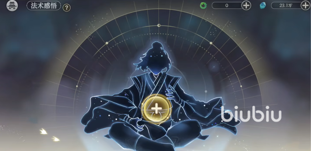 如果大家想要感悟法术的话,可以先点击选项当中的法术感悟。进去之后就可以看到一个正在打坐的人,这时在他的胸口处有一个加号。大家可以点击这个加号,然后就会显示出你当前所拥有的所有法术。